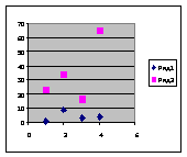 Точечная диаграмма отображает взаимосвязь между числовыми значениями в нескольких рядах и представляет две группы чисел в виде одного ряда точек в координатах xy. Эта диаграмма отображает нечетные интервалы (или кластеры) данных и часто используется для представления данных научного характера. При подготовке данных следует расположить в одной строке или столбце все значения переменной x, а соответствующие значения y - в смежных строках или столбцах.