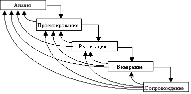 Каскадный подход хорошо зарекомендовал себя при построении ИС, для которых в самом начале разработки можно достаточно точно и полно сформулировать все требования, с тем чтобы предоставить разработчикам свободу реализовать их как можно лучше с технической точки зрения. В эту категорию попадают сложные расчетные системы, системы реального времени и другие подобные задачи. Однако, в процессе использования этого подхода обнаружился ряд его недостатков, вызванных прежде всего тем, что реальный процесс создания ПО никогда полностью не укладывался в такую жесткую схему. В процессе создания ПО постоянно возникала потребность в возврате к предыдущим этапам и уточнении или пересмотре ранее принятых решений. В результате реальный процесс создания ПО принимал следующий вид (рис. 1.2):