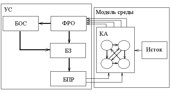 Работу системы проиллюстрируем на рис. 5.8.1. В систему входят модель среды, состоящей из КА и Истока, и УС, состоящей из блоков ФРО, БОС, БЗ, БПР.