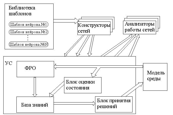 В отделе имитационных систем Института Системного Программирования РАН разработан метод автономного адаптивного управления (ААУ). Предполагается, что система ААУ может быть полностью реализована на нейронной сети [Диссер, Жданов1-9]. В отличии от традиционного использования НС для решения только задач распознавания и формирования образов, в методе ААУ согласованно решаются задачи