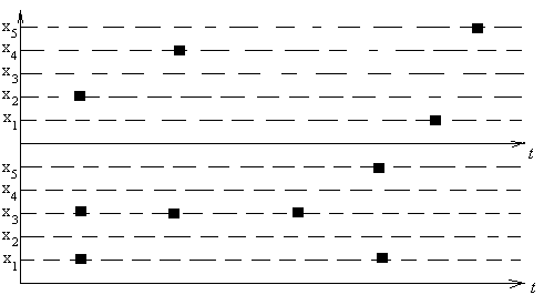 Для отладки сетей часто необходимо знать разнообразную информацию о состояниии сети и отдельных ее элементов в некоторые моменты времени. Сети предполагаются гетерогенные, то есть состоящими из разных элементов-экземпляров классов-потомков ЭлементаСети, и состояние каждого элемента в некоторые моменты времени может характеризоваться, вообще говоря, некоторым своим набором параметров, помимо значения выходного и входного сигналов. Например, КА лучше охарактеризовать состоянием, в котором находится автомат. Поэтому схема была выбрана следующая: ЭлементСети является производным классом от Летописец, который имеет методы для записи объектов Событие в некоторую временную последовательность История, которую хранит каждый Летописец. В процессе работы сети каждый Летописец записывает в Историю один из своих или общих объектов подкласса Событие. Например, КА записывает помимо прочих событие СостояниеКА, в котором есть поле для указания состояния КА в данный момент времени. Каждый (потомок класса) АнализаторРаботыСети умеет обрабатывать Истории, извлекая оттуда необходимую информацию, и затем выдавая ее в удобном виде на экран. В примере 5.8.1 приведен результат работы программы, где изображена диаграмма выходных сигналов выбранных ЭлементовСети, имена которых выведены в первой строке диаграммы. Диаграмма получена как результат обработки Истории выбранных ЭлементовСети АнализаторомРаботыСети.