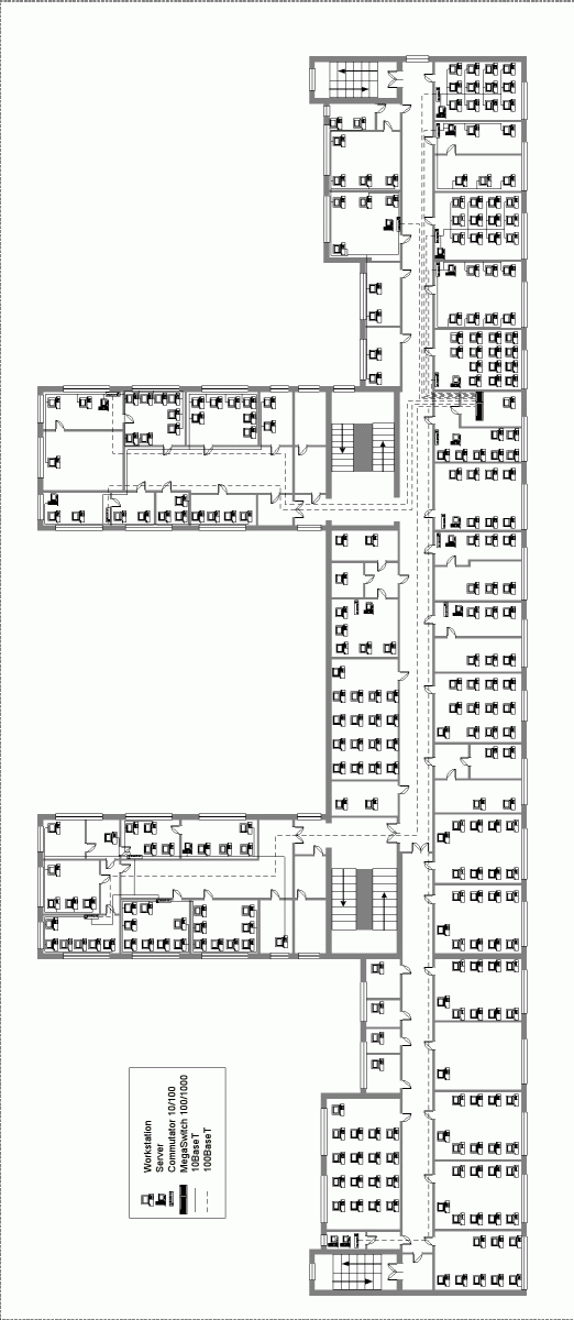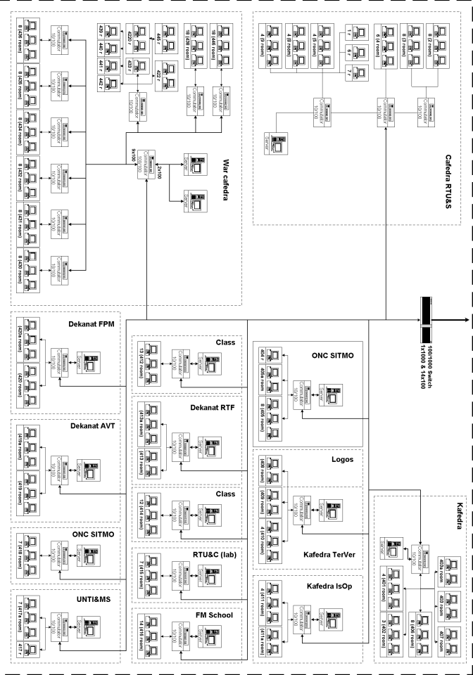 4. Пиковая нагрузка, которую создают рабочие места сотрудников кафедр, занимающихся организационными вопросами, невелика, т. к. в основном это документооборот. Внутри этих отделов вполне достаточно пропускной способности 10-мегабитного Ethernet.