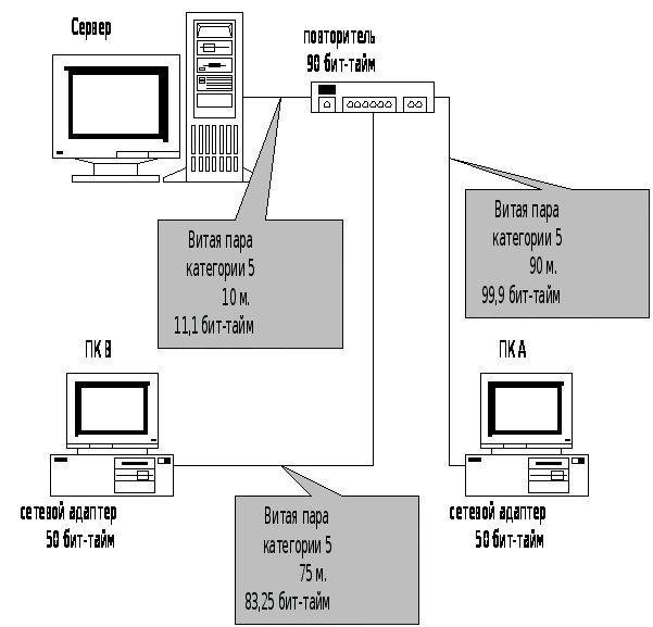 Различные типы кабелей и устройств Fast Ethernet дают разную величину задержки RTD. Витая пара категории 5 – 1,11 бит-тайм на метр длины, оптоволоконный кабель 1 бит-тайм также на метр длины, сетевой адаптер – 50 бит-тайм, медиаконвертеры от 50 до 100, повторитель класса I –140, повторитель класса II – 92 бит-тайм. Задержку RTD между двумя сетевыми узлами рассчитать несложно, она равняется сумме соответствующих задержек их сетевых адаптеров и всех промежуточных сетевых компонентов (кабелей, повторителей).