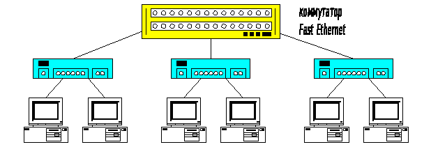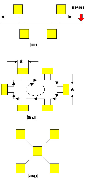 Способ соединения компьютеров называется структурой или топологией сети. Сети Ethernet могут иметь топологию “шина” и “звезда”. В первом случае все компьютеры подключены к одному общему кабелю (шине), во втором - имеется специальное центральное устройство (хаб), от которого идут “лучи” к каждому компьютеру, т.е. каждый компьютер подключен к своему кабелю.