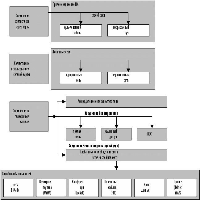 Рисунок 1 - Способы коммутации компьютеров и виды сетей.