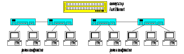 В сети Fast Ethernet организуются несколько доменов конфликтов, но с обязательным учетом класса повторителя, используемого в доменах.