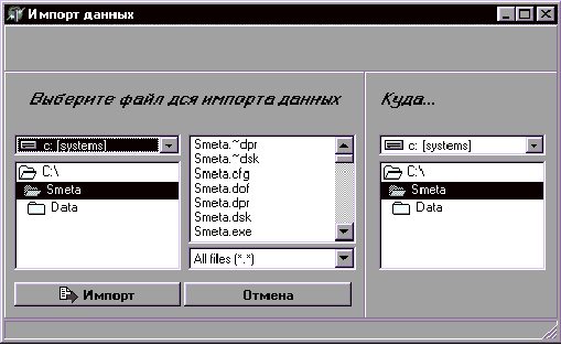Описание: Для того, чтобы получить информацию из другой системы необходимо выбрать файлы подлежащие импортированию в правом окне и путь импорта в левом, и нажать кнопку “Импорт”.