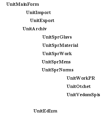Стартующим при запуске системы, является модуль UnitMainForm. Данный модуль не содержит принципиальных процедур или функций непосредственно влияющих на процессы системы, т.е. модуль не содержит ни каких алгоритмов обработки информации. Основное его назначение – это меню вызова нижележащих по иерархии модулей, непосредственно отвечающих за ввод, хранение, обработку и вывод информации. Модуль является как бы “подложкой” для системы, с закрытием его вся система прекращает функционирование.