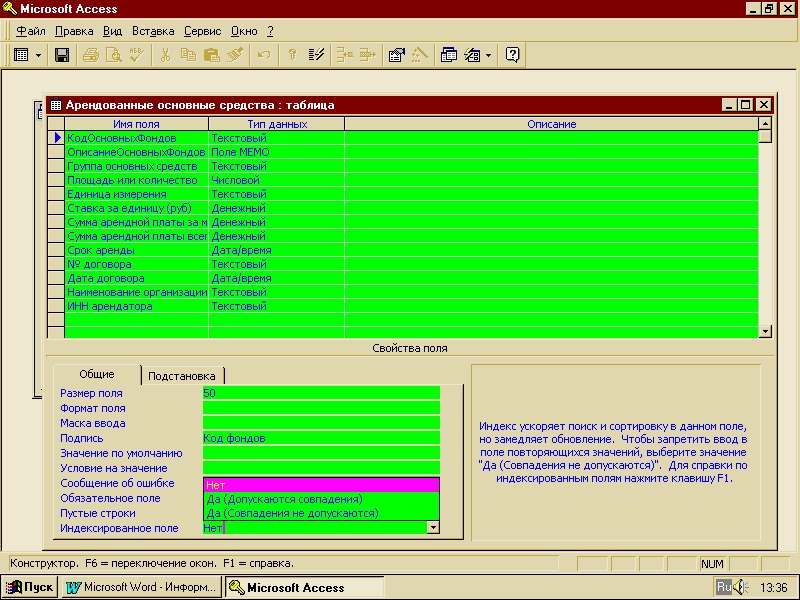 Access автоматически индексирует поле первичного ключа. Для этого нужно выделить в режиме конструктора таблиц поле или поля, которые нужно проиндексировать, щелкнуть правой кнопкой мыши, и выбрать в контекстном меню пункт Ключевое поле. Кроме того, в том же режиме конструктора можно на вкладке свойств поля выбрать свойство Индексированное поле для любого поля. Потом при желании иметь отсортированную по возрастанию (убыванию) информацию, можно, нажав кнопку Индексы на панели инструментов, выбрать в поле Порядок сортировки соответствующую строку и установить желаемый порядок.