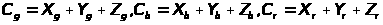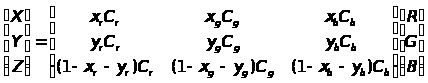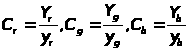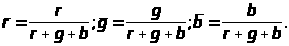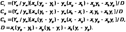 Представим цвет С как вектор с составляющими rR, gG, bB. Пересечение вектора C с единичной плоскостью R+G+B=1 дает относительные веса его красной, зеленой и синей составляющих. Их также называют значениями или координатами цветности: