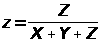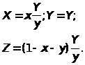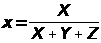 В 1931 был принят стандарт CIE (Commission International de l’Eclairage - Международная комиссия по освещению), в качестве основы которого был выбран двумерный цветовой график и набор из трех функций реакции глаза, исключающий отрицательной области и удобный для обработки. Гипотетические цвета CIE - X, Y и Z. Треугольник XYZ задан так, что в него входит видимый спектр. Координаты цветности CIE (x, y, z) задаются следующим образом: