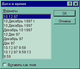 Наконец, можно вставить в текст документа текущее время и дату - для этого выполните команду Дата и время (Date And Time) из меню Вставка и найдите в появившемся списке подходящий формат (рис. 2). Если установить флажок Вставить как поле (Insert As Field), то Word автоматически будет обновлять дату и время при каждой печати документа; в противном случае дата и время останутся такими, какими они были в момент вставки.