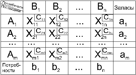 Условия задачи удобно располагать в таблицу, вписывая в клетки количество перевозимого груза из A>i> в B>j>> >груза X>ij> > 0, а в маленькие клетки - соответствующие тарифы C>ij>: