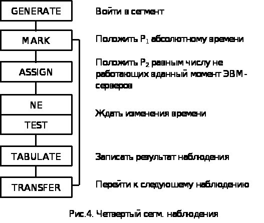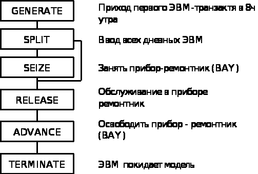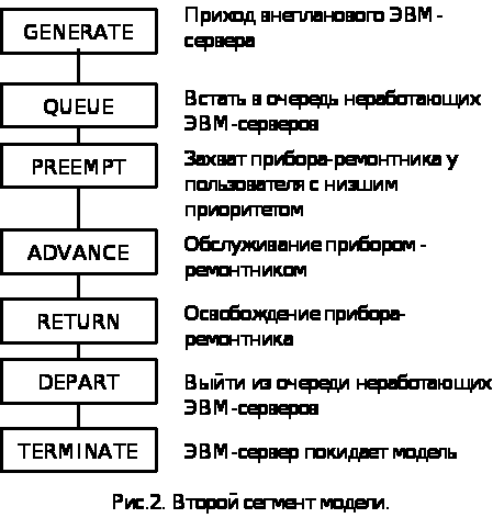 После выхода из строя ЭВМ транзакт покидает NOWON . При этом возникает возможность у другой резервной ЭВМ войти в него, и если транзакт ожидает возможность войти в многоканальное ус-во MEN (ремонтная группа. которая м. б. представлена даже одним ремонтником). Выйдя из MEN транзакт становится восстановленной ЭВМ. После ремонта он покидает MEN , освобождая ремонтника, который может начать немедленно ремонт другой ЭВМ. Сам транзакт поступает в ту часть модели, из которой он начинает попытки войти в NOWON.