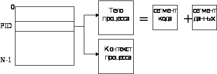 Рассмотрим информативную нагрузку таблицы. В строке-записи таблицы находится ссылка на контекст процесса, там же находится ссылка на тело процесса. Телом процесса мы будем называть набор команд и данных, которыми оперирует процесс.