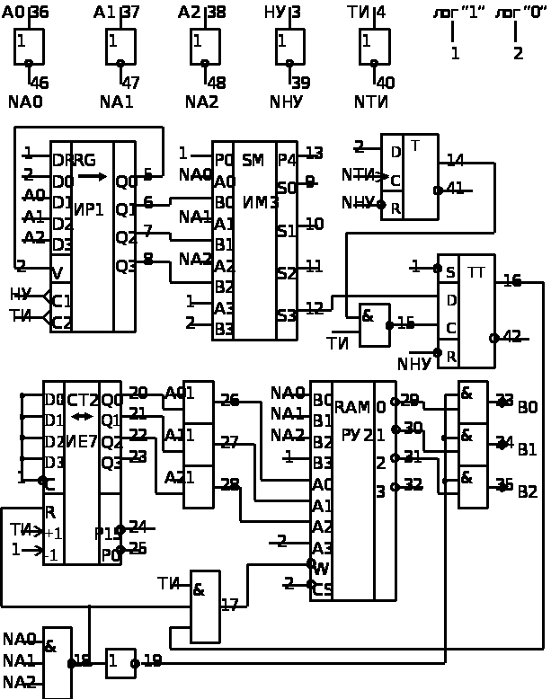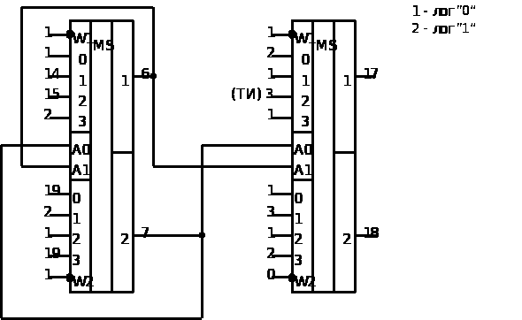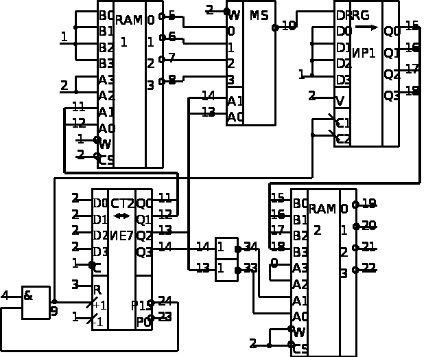 9.Схема, выполняющая транспонирование квадратной матрицы 4*4 однобитовых элементов. Исходная матрица размещена в ячейках 0,1,2,3 RAM-1. Транспонированная матрица размещается в RAM-2.