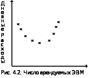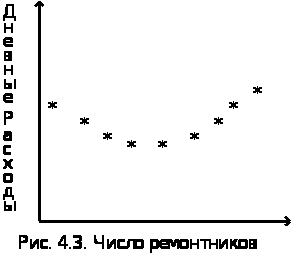 При фиксированном числе ремонтников и при достаточно малом числе -арендуемых машин, расходы велики из-за снижения производительности ВЦ. При большом числе Дарендуемых машин, расходы велики из-за их избыточного числа. Очевидно, необходимо найти минимум между этими значениями (Рис.4.2).
