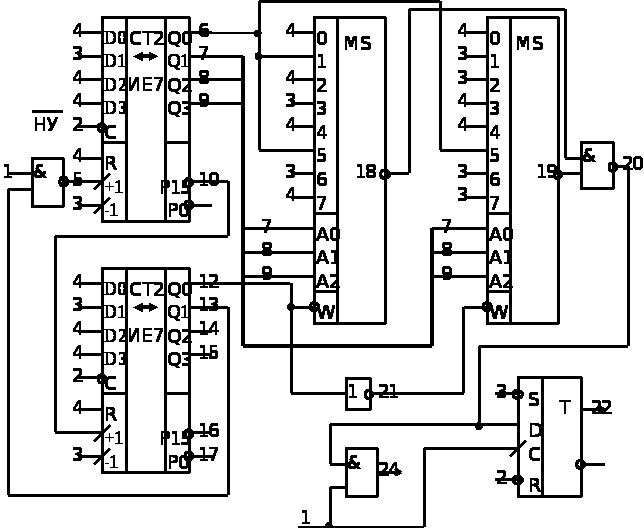 6.Схема, однократно вырабатывающая последоватеьлность сигналов 010011000111000011110000011111 в виде импульсов (выход 24) или потенциалов (выход 22). Сигнал начальной установки поступает на вход 2, синхроимпульсы - на вход 1.