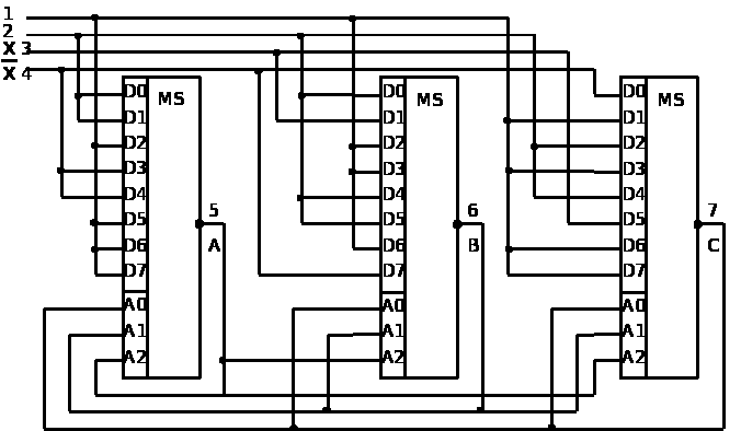 5.Схема содержит цифровой автомат на мультиплексоре 1 с циклической последовательностью состояний АВ=(00,01,11,10) и комбинационную логику на мультиплексоре 2, выходные сигналы которой зависят от состояний автомата и тактовых сигналов на входе 3