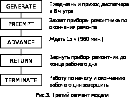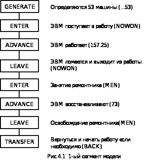 После выхода из строя ЭВМ транзакт покидает NOWON . При этом возникает возможность у другой резервной ЭВМ войти в него,и если транзакт ожидает возможность войти в многоканальное ус-во MEN (ремонтная группа. которая м.б. представлена даже одним ремонтником). Выйдя из MEN транзакт становится восстановленной ЭВМ. После ремонта он покидает MEN , освобождая ремонтника, который может начать немедленно ремонт другой ЭВМ. Сам транзакт поступает в ту часть модели, из которой он начинает попытки войти в NOWON.