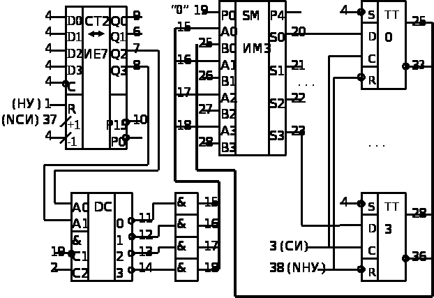 7.Схема, которая на одном их выходов дешифратора вырабатывает непрерывную серию импульсов.Номер выхода и число импульсов в серии зависят от числа "1" на входах 1,2,3,4.