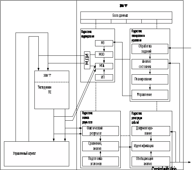 Имитируемый поток входной информации подается' на вход испытываемого ПО АСУ и инициирует его функционирование, результатом которого является поток выходной (управляющей) информации, выдаваемый на УТА или его модель. Образуется замкнутый контур управления, адекватный контуру управления в реальном ДТК.
