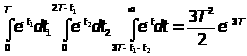 Вероятность того, что будет задержан один самолет, найдем, рассмотрев все задержки одиночных самолетов между двумя незадерживаемыми самолетами. Самолет, который будет задержан, должен прибыть через промежуток времени t>1><T после прибытия незадерживаемого самолета, непосредственно предшествующего ему, а незадерживаемый самолет, непосредственно следующий за ним, должен прибыть через промежуток времени t>2T-t>1> . Таким образом, искомая вероятность совместного появления этих двух событий равна