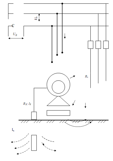 Защитное заземление называют преднамеренное электрическое соединение с землей или ее эквивалентом металлических нетоковедущих частей электроустановок, которые могут оказаться под напряжением. Заземляют все электрические установки, работающие при номинальном напряжении переменного тока более 120 В (кроме светильников, подвешенных в помещениях без повышенной опасности поражения электрическим током на высоте не менее 2 м при условии изоляции крючка для подвески светильника пластмассовой трубкой). Заземляющее устройство (рис. 2) состоит из заземлителя и проводника, соединяющего металлические части электроустановок с заземлителем. В качестве искусственных заземлителей применяют заглубленные в землю стальные трубы, кабели с металлической оболочкой (кроме алюминиевой), обсадные трубы артезианских колодцев и т.п. Принцип действия защитного заземления заключается в снижении до безопасных значений напряжений прикосновения и шага в случае появления электрического потенциала вследствие замыкания тока на металлические корпуса электрооборудования, разряда молнии или других причин.