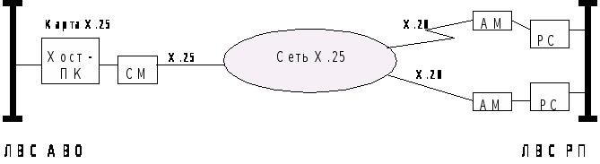 Этот вариант предусматривает в себе следующее. В хост ЛВС АВО устанавливается специальная карта Х.25 (допустим Eicon card) или же устанавливается маршрутизатор(и то и другое будет являться сервером удаленного доступа). В РС ЛВС районных пользователей должна быть установлено специальное программное обеспечение, позволяющее работать пользователям с ресурсами ЛВС АВО в режиме удаленного узла (рис.1.5.3).