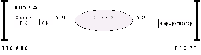 Подключение таких ЛВС к сети Х.25 происходит по выделенным каналам связи по протоколу Х.25. Цена такого варианта немного ниже, чем в первом случае, но есть и определенные проблемы (например, ограничение по количеству одновременно работающих удаленных пользователей).