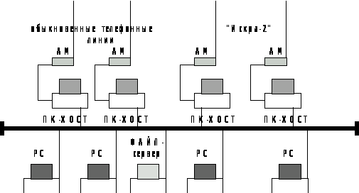 - 4 коммуникационных серверов(хостов), 2 из которых подключены к обычной коммутируемой телефонной линии и 2 к коммутируемой телефонной линии “Искра-2”;