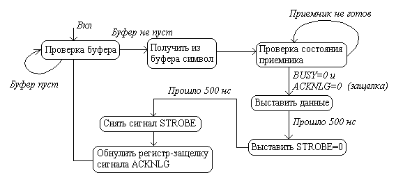 В графической части представлена схема алгоритма процесса передачи в однопроходной форме. После размыкания циклов задачи получилось две ветви. Первая – ожидание заполнения буфера данных. Вторая – собственно посылка буфера. За один проход задачи посылается один символ. Выбор ветви осуществляется с помощью переменной Sentry. Обмен информацией идет по стандарту интерфейса ИРПР-М. При посылке байта для соблюдения необходимых временных интервалов формируются паузы не менее 0,5 мкс. При проверке готовности приемника происходит логическое сложение сигналов BUSY и ACKNLG, и если результат равен нулю, выполняется отправка одного байта. По окончании передачи всего сообщения флаг готовности буфера сбрасывается.