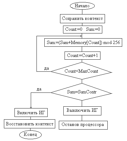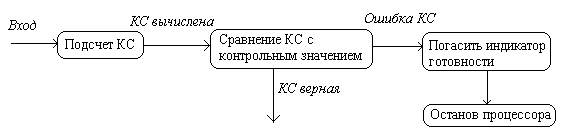 Подсчет контрольной суммы ПЗУ (КС) ведется в цикле. В случае несовпадения рассчитанного значения с контрольными данными происходит останов процессора. Блок “Подсчет КС” обозначает циклический процесс по суммированию по модулю 256 содержимого ячеек ПЗУ.