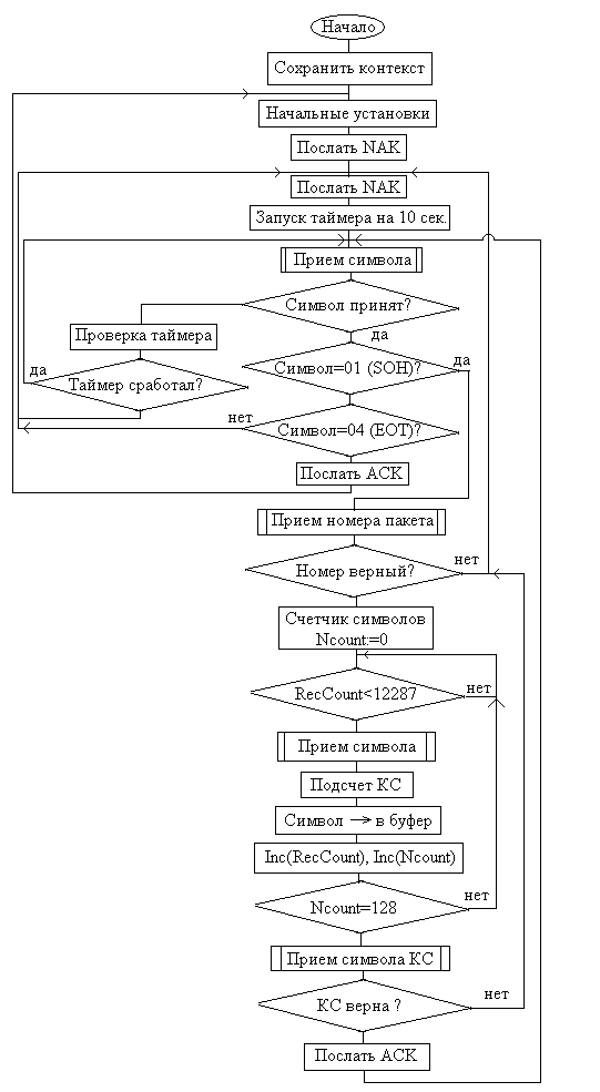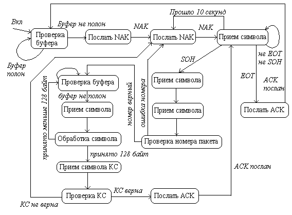 Так как прием информации осуществляется пакетами, то в основе схемы лежит диаграмма состояний при использовании протокола X-Modem.