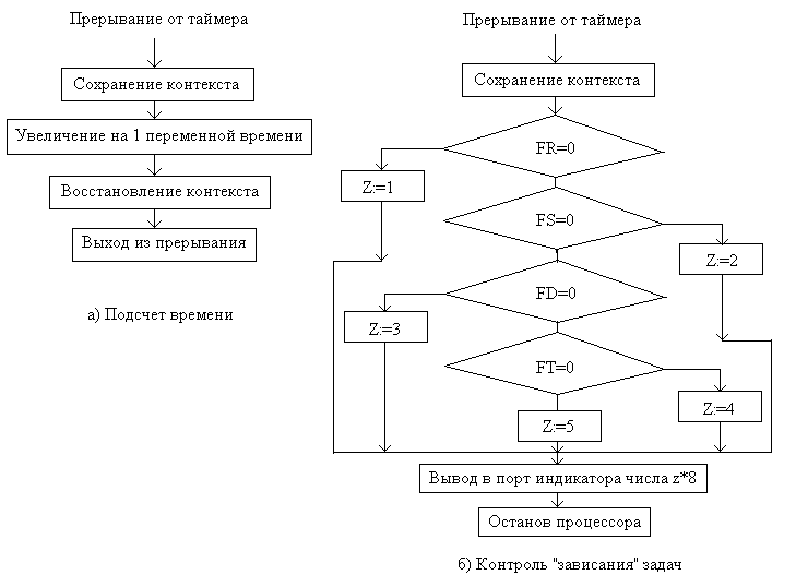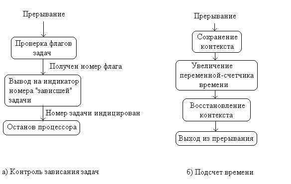 Служба времени решает две задачи. Это контроль зависания задач и формирование переменной, содержащей текущее время от начала работы контроллера. Конторль зависания осуществляется следующим образом. Перед началом каждого цикла прохода подпрограмм диспетчер запускает таймер, работающий в роли одновибратора. Время срабатывания таймера заведомо больше времени одного цикла работы диспетчера. Поэтому, если все задачи отработали успешно, таймер не успеет сработать до следующего перезапуска. Если таймер сработает и вызовет прерывание, то это сигнализирует о “зависании” одной из задач. В данной ситуации требуется немедленно остановить работу процессора. При подсчете времени таймер генерирует импульсы определенной частоты, по которым контроллер прерываний формирует запросы на прерывание для процессора. Обработчик этих прерываний каждый раз наращивает на единицу переменную-счетчик времени.