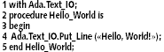 Легко видеть, что код на Аде похож на код на Паскале, который был выбран в качестве его прототипа. Первая строка описывает связь данного компилируемого модуля с другими модулями – указывается, что подпрограмма Hello_World должна компилироваться совместно с модулем Ada.Text_IO, который является компонентом предопределенной библиотеки.