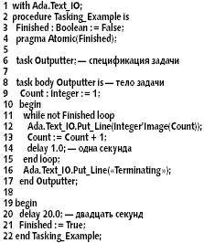 В разделе локальных объявлений процедуры Tasking_Example описывается задача Outputter (строка 6, строки с 8 по 17 содержат тело этой задачи). Когда управление в процессе, соответствующем процедуре Tasking_Example, доходит до строки 20, перед тем, как выполнить этот первый оператор, запускается процесс, соответствующий задаче Outputter, после чего два этих процесса живут и асинхронно выполняются независимо друг от друга. Выполнение оператора задержки (строки 14 и 20) состоит в приостановке соответствующего процесса на указанное количество секунд. Таким образом, процесс Tasking_Example приостанавливается на 20 секунд, а в это время процесс Outputter начинает печатать значения увеличивающегося на единицу счетчика, приостанавливаясь на одну секунду после вывода каждого значения. По истечении 20 секунд процесс Tasking_Example устанавливает флаг Finished в положение "истина", в результате завершается цикл в процессе Outputter. Спецификация переменной Finished как атомарного объекта данных (строка 4) делает невозможным одновременное чтение и изменение значения этой переменной.