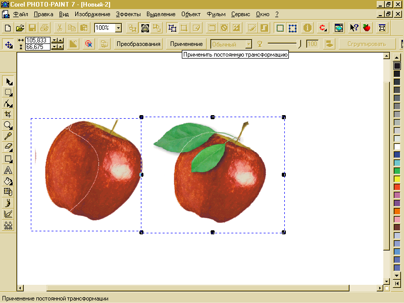 ЗАМЕЧАНИЕ. В качестве одного из возможных приемов ретуширования можно предложить клонирование противоположной стороны черенка яблока поверх черенка, чтобы закрыть его. После этого можно построить плавный цветовой переход в пределах черенка.