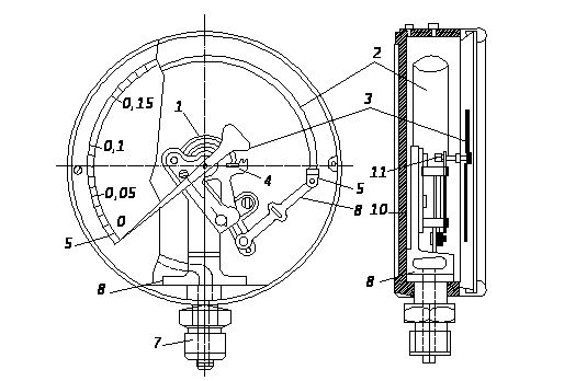 3 — стрелка ; 4 — зубчатый привод; 5 — шарнир; 6 — плечо;