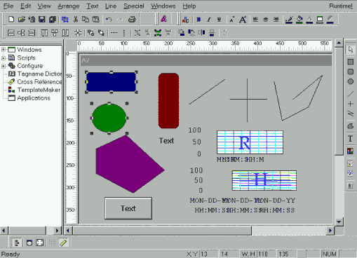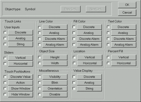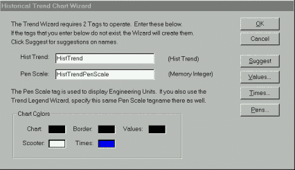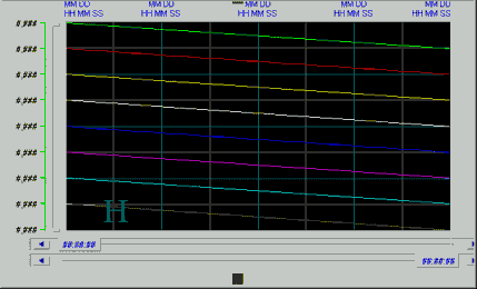 График представляет собой прямоугольную область с нанесенными координатными прямыми, на которой графически представляется изменение значения одной или нескольких переменных в течение времени. В пакете InTouch имеются объекты для динамического отображения значения переменной в реальном времени – графики реального времени (инструмент (Real-time Trend)), и, так называемые, аналитические кривые, которые строятся на основании архивных данных (инструмент (Historical Trend)). Для того, чтобы он появился в созданном нами окне, необходимо на Панели Инструментов InTouch – Tools выбрать пункт Real – Time Trend и затем в окне приложения, удерживая нажатой левую кнопку мышки, придать графику необходимые размеры.
