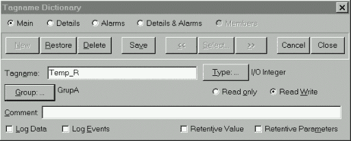 Панель настройки графиков вызывается двойным щелчком левой кнопки мышки по окну графика и состоит из четырех текстовых строк соответствующих графикам (Graph 1, Graph 2, Graph 3, Graph 4). Каждый график имеет независимые настройки масштаба и величины сдвига по вертикали, отображаемые на экране. Для этого используется компонент Analog Tagname Display (Wizard Selection Value Displays Analog Tagname Display). Ввод данных осуществляется не непосредственно в WindowViewer, а посредством компоненты Incr/Decr Buttons Up/Down (Wizard Selection Buttons Incr/Decr Buttons Up/Down). Нажатие на верхнюю или нижнюю стрелку приводит соответственно к увеличению или уменьшению значения переменной. Ограничение максимального и минимального значения указываются при декларации. Каждый компонент связан со своей переменной zoom1 – zoom4 (изменение масштаба графиков 1 – 4 соответственно) и sh1 – sh4 (изменение смещения графиков 1 – 4). Все переменные имеют тип Memory Integer. Для того, чтобы ввести новую переменную, необходимо описать ее в разделе Special/Tagname Dictionary/New. При этом необходимо указать ее имя в поле «Tagname:» и тип – в поле «Type:».