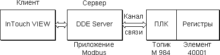 Для организации обмена данными через DDE интерфейс необходимо определить четыре (по числу каналов) переменные типа DDE Integer (Item1, Item2, Item3, Item4). Для этого сначала в разделе Special/DDE Access Names… необходимо нажать кнопку Add и в появившемся диалоговом окне указать имя приложения (DDE Application/Server Name), от которого будет производиться запрос данных, и имя группы/объекта (DDE Topic Name), содержащего требуемую информацию. В нашем случае качестве имени приложения используется имя DDEServer, имя объекта – DDETopic. Далее в разделе Special/Tagname Dictionary/New вводятся поочередно переменные типа DDE Integer. Название элемента (Item) для каждой переменной имеет различные имена: DDEItem100 – для Item1, DDEItem200 – для Item2, DDEItem300 – для Item3 и DDEItem400 – для Item4. Данная информация используется для определения DDE-переменной в Словаре Переменных InTouch.
