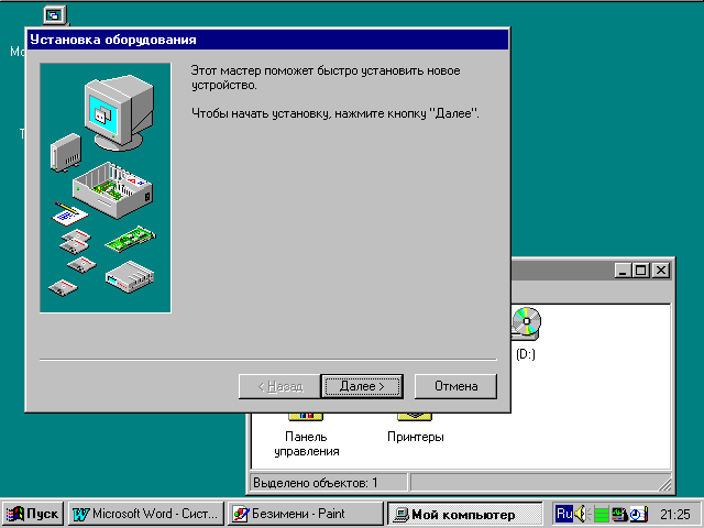 Процедура модернизации аппаратуры компьютера, управляемого Windows 95, чрезвычайно проста. Установите и подключите новое устройство руководствуясь инструкцией, прилагающейся к нему. Затем запустите Windows. В меню Пуск выберете команду Настройка и в развернувшемся подменю щелкните на команде Панель управления. В появившемся диалоговом окне Панель управления 2 раза щелкните мышью на значке Установка оборудования. В диалоговом окне Мастера установки оборудования щелкните на командной кнопке Далее. Нажмите селекторную кнопку автоматического поиска нового оборудования и нажмите кнопку Далее. В следующем окне также нажмите кнопку Далее. После этого Windows проверяет подключенные к системе устройства и пытается самостоятельно распознать их тип. По завершении распознавания аппаратных средств в следующем диалоговом окне вы можете щелкнуть на командной кнопке Сведения и посмотреть, какие новые элементы были распознаны Windows. Проверьте, совпадают ли идентифицированные элементы с теми, которые вы установили. Щелкните на Далее.
