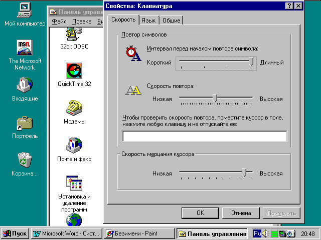 В меню Пуск выберете команду Настройка и в подменю щелкните на команде Панель управления. В появившемся диалоговом окне Панель управления, 2 раза щелкните на значке Клавиатура. С помощью регулятора Интервал перед началом повтора символа определите как долго следует удерживать клавишу нажатой, чтобы система начала автоматический повтор ввода соответствующего символа. Регулятор Скорость повтора позволяет устанавливать частоту повторения символа удерживаемой клавиши. Результаты выполненных в группе Повтор символа установок можно оценить не закрывая диалогового окна Свойства: Клавиатура. Достаточно щелкнуть мышью в текстовом поле в нижней части группы Повтор символов и, нажав произвольную текстовую клавишу, проверить начальный интервал и частоту повтора. В поле Скорость мерцания курсора определите частоту мерцания курсора.