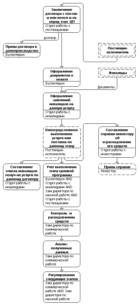 В соответствии с темой дипломного проекта был подробно проработан ФУБ процессом разработки и реализации целевых программ, разработанная модель которого представлена на плакате 6. Кроме того, как уже отмечалось, были проанализированы информационные потоки и каналы информационного взаимодействия структурных подразделений РООИ «Соратник» между собой и внешними организациями в процессе разработки целевых программ. Результаты этого анализа, определяющие предпроектную информационную модель процесса разработки и реализации целевых программ в РООИ «СОРАТНИК» представлены в виде схем документооборота на плакате 3 и схемы взаимодействия по финансовым вопросам – на плакате 4.