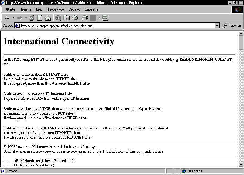 Рисунок 1.2.На сервере “Петерлинк” вы найдёте не только полный список доменных имён государств, но и характеристику сервисов Internet на этих территориях