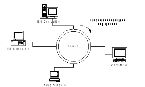 Кольцевая сеть (рис. 3) характеризуется наличием замкнутого однонаправленного канала передачи данных в виде кольца или петли. В этом случае информация передается последовательно между адаптерами рабочих станций до тех пор, пока не будет принята получателем и затем удалена из сети. Обычно за удаление информации из сети отвечает ее отправитель. Управление работой кольцевой сети может осуществляться централизовано с помощью специальной мониторной станции, либо децентрализовано за счет распределения функций управления между всеми рабочими станциями. Недостатком кольцевой топологии является то, что отказ одного звена кольца может вывести из строя всю локальную сеть. С целью повышения надежности кольцевых структур используют специальные безразрывные коммутаторы, позволяющие автоматически отключать неработающие компьютеры или отдельные сегменты сети.