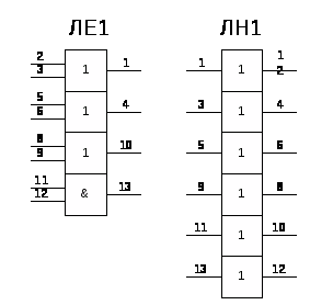 Микросхемы типа ЛЕ выполняют логическую функцию «ИЛИ-НЕ», микросхемы типа ЛН представляют собой инверторы и выполняют логическую операцию «НЕ». Их условные обозначения и цоколёвка представлены на рис.12.