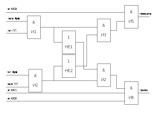 Приёмопередатчик прослушивает моноканал и при обнаружении заголовка кадра загружает в регистр данные, следующие после заголовка до концевика кадра, и устанавливает единичное значение в служебной части кадра, если станция имеет пакет на передачу. В декодер кадров поступает служебная информация принятого кадра. Декодер кадров сравнивает приоритет своей станции с наивысшим приоритетом и выдает результат в блок управления сигналом С1. Блок управления анализирует сигнал С1 и выдаёт команду С5 если приоритет станции является наивысшим, С2 станция хочет принять данные. С4 сигнализирующий о наличии готовых к передаче данных во входном буфере. Сигнал С6 поступает в блок памяти при инициализации блока управления доступом, т.е. при записи в блок памяти собственного адреса, который нужен для формирования кадра. СЗ - если станция хочет принять пакет.