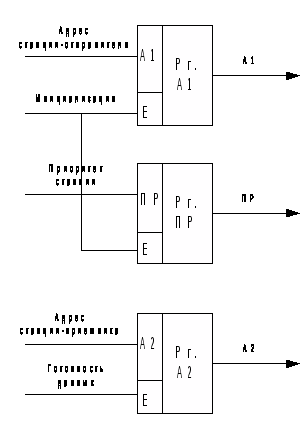 Блок формирования кадра (рис. 8) состоит из четырех регистров. Регистры адреса включаются на загрузку по команде «сформировать кадр данных» и на их вход данных поступают адреса станции-отправителя и станции-приёмника, а также приоритет станции. Регистр данных загружается данными для передачи по команде «сформировать кадр данных».